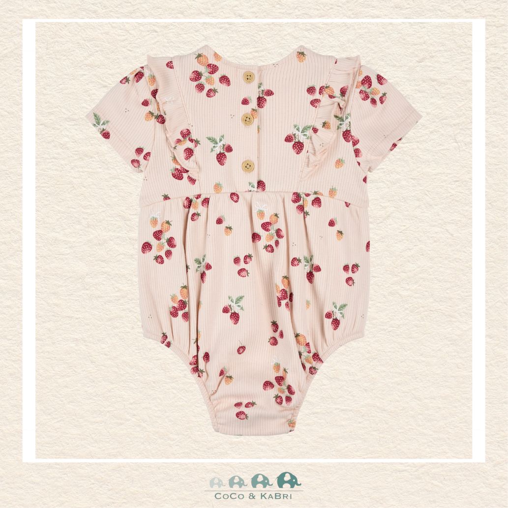 Petit Lem: Strawberry Print on Soft Pink Ribbed Bubble Romper
