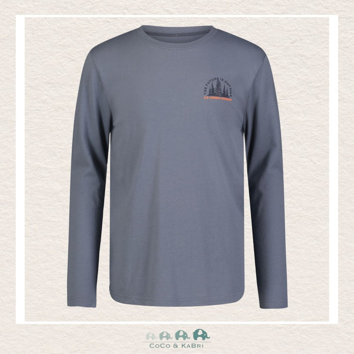 Step up his casual wardrobe with this gray long sleeve tee from Under Armour, featuring a bold orange logo. Perfect for any active boy, this shirt effortlessly combines style and comfort for all-day wear. Get ready for a winning combo with this playful addition to his wardrobe!